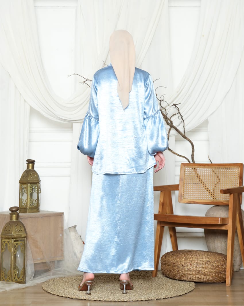 Material: Premium Shimmer Silk (Karakter bahan jatuh/flowy, memiliki kilau mewah yang halus, sangat lembut di kulit, dan tidak menerawang).